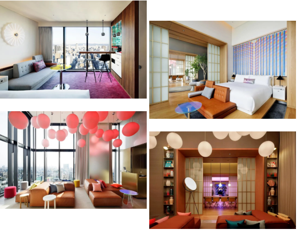 受到道頓掘地區的霓虹彩燈文化的影響,酒店大量引入霓虹燈的元素,使用鮮艷活潑的配色,以華麗張揚的風格建構出大阪街景的活力景象。