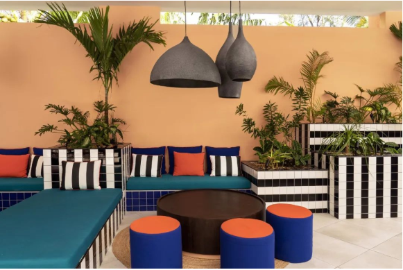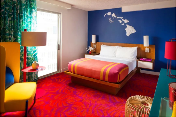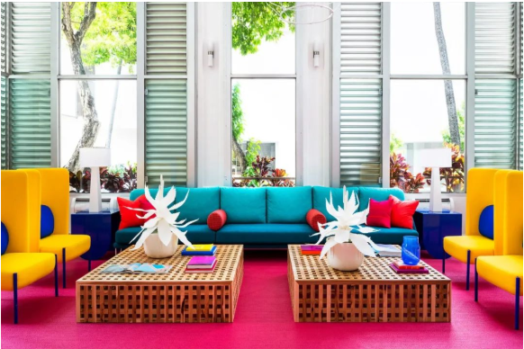 酒店突出色彩沖突的“自然與霓虹燈”的主題配色,是設計師Dan Mazzarini領導的團隊呈現的配色方案,他們采用了可以找得到的最明亮的顏色的家具和面料來進行色彩裝飾。