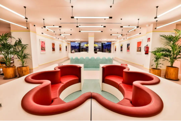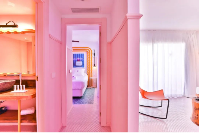 走進伊維薩天堂藝術酒店,瞬間就像掉入一個如夏日冰淇淋一般甜蜜繽紛的多彩世界:地面鋪設了粉紅色的馬賽克瓷磚,涂漆的墻壁和天花板,大廳中央巨型花型紅色沙發……無不帶來強烈的視覺沖擊感