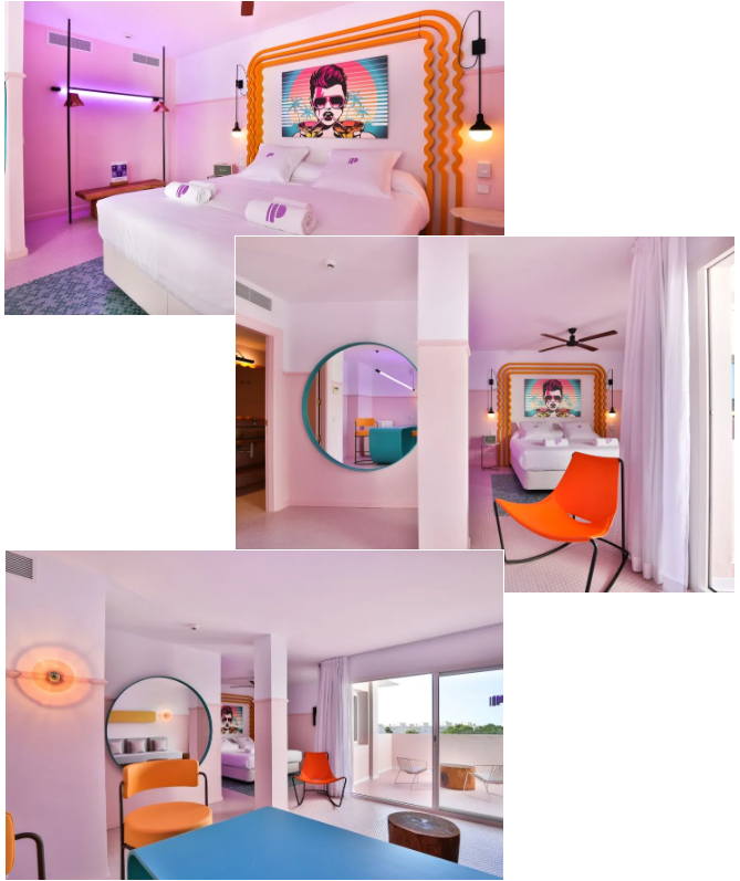 伊維薩天堂藝術酒店位于以電音文化聞名于世的西班牙小島Ibiza,由西班牙工作室Ilmiodesign設計,有60位不同領域的藝術家參與設計,靈感來源于城市藝術和柔和色調融合的邁阿密海灘,以及七十年代意大利激進主義建筑。