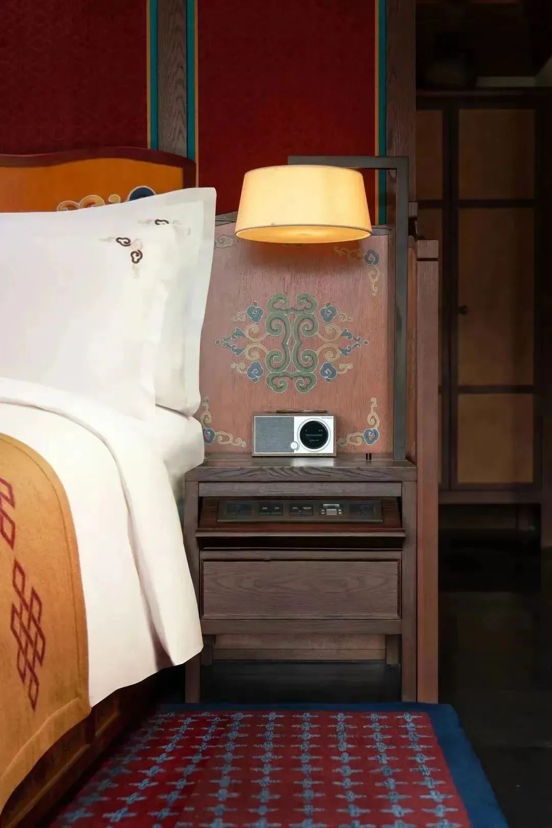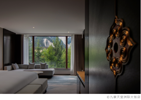 公共區域和客房室內的設計融合藏羌漢文化,尤其木質元素和暗系色調的運用,彰顯了酒店內斂的非凡格調與考究質感。